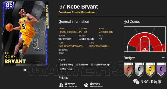 蓝卡中仅分析一下唠嗑吧,除了自由球员外的第一张科比球员卡,2K对这位市场影响力巨大的已退役巨星还是非常照顾的,属性总值为3518,虽然仅仅是一张总评85的蓝卡,但总值可能比一些红卡还要高。这张小飞侠时期的8号蓝宝石科比最为突出的大项也给到了运动能力,内线得分能力非常强,运扣隔扣纷纷给到了92,再配上隔扣徽章,内线进攻能力非常可观。