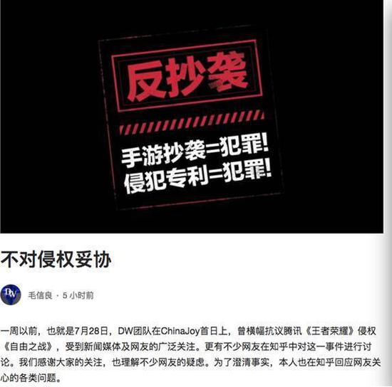 在2016年的ChinaJoy大会上,《自由之战》在腾讯展台拉横幅抗议《王者荣耀》抄袭专利操作系统,抗议之后不久,知乎上一篇“如何评价《自由之战》团队在2016年ChinaJoy上控诉腾讯《王者荣耀》抄袭?”的话题引起了网友的火热讨论,作为一个重度知乎用户,小编也是由此开始关注《自由之战》反对《王者荣耀》抄袭事件的。