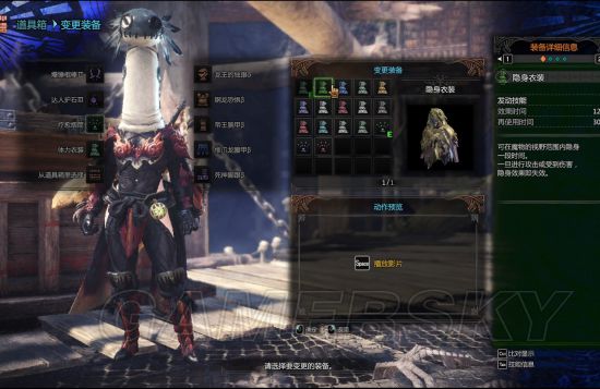 第二个隐身衣 图2 隐身衣一般是抓一下稀有小动物或者捕鱼下去来一网子用的。隐身衣持续120秒。但是如果你动了的话隐身衣会缩短使用时间,就是你动一下掉一片树叶,树叶掉完了你也不隐身了。隐身衣也可以拿来进行脱战,在与怪物战斗状态下使用隐身衣后会脱离战斗,怪物找不到你,但是会用鼻子嗅你上一次所在的位置。