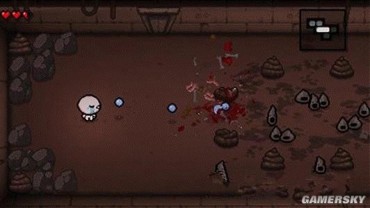 除此之外,以撒还能够操控大便进行“屎味”攻击击败敌人。一些地图中还会出现各种便便聚合体变成的怪物,带着一身残渣向玩家发起冲锋。不得不说的是,《以撒》的场景细节做得相当不错,但凡是涉及到和屎有关的内容互动后,地上总是会留下一滩“颜色相近”的污渍。