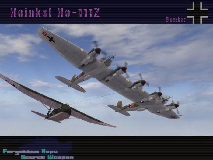 He-111Z,德国在二战中期建造的双机身战机,由两架轰炸机拼接而成,其使命是牵引Me-323升空,在FHSW中,该机也可以携带炸弹