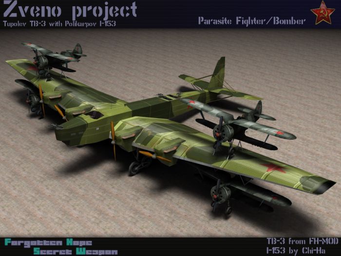 “Zveno”子母机。二战前,苏军对一些轰炸机进行了改装,让其可以在机翼上下挂载4架战斗机,在二战初期,苏军曾利用这种机型奇袭过罗马尼亚的炼油基地。