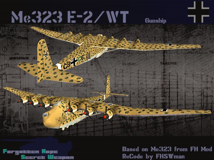 Me-323 E2-WT,二战德国利用Me-323滑翔运输机改装的炮艇机,在现实中,该机主要负责为机群担任护航,但在FHSW中,该机却是一种威力超强的对地攻击武器