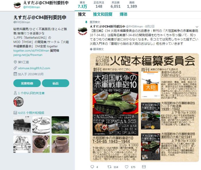 无法形成利益链,也为mod的生态蒙上了阴影。一个耐人寻味的细节可以证明这种变化:在FHSWman的twitter首页,长期置顶的不是mod的更新动态,而是一本小册子:《伟大卫国战争中的苏军坦克炮》,这本册子曾在C94上发售——如今,他已将更多精力用于制作军宅向的画册——与毫无盈利的mod相比,它们至少能带来稳定收益。