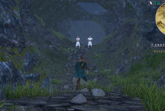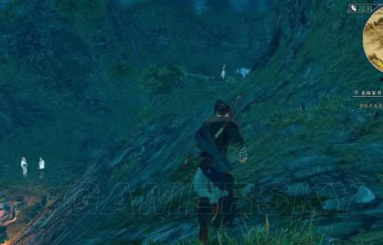 沿着路走,确保你的左侧一直有孔洞,一直到山顶,能看到远处有一个站岗的NPC