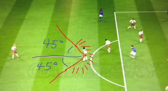 其实圆规假射的主要用处也是在这里,在瞬间调整自己的朝向,从而取得射门或者传球的更好身位,我们用个图片来解析一下这个站位。