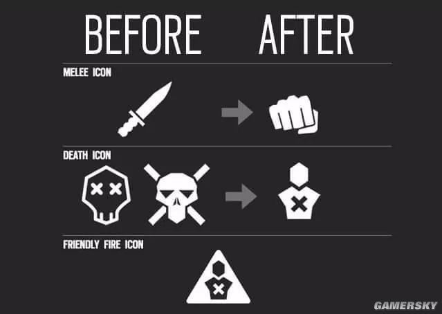 在图标方面,近战肉搏击杀(Melee Icon)的图标自原来的匕首修改成了拳头,被击杀的标识从原来的骷髅修改成了在人形上加一个×。地图的修改则更加突出,原本墙上类似稻草人骷髅的标识,如今变成了眼窝部分被戴上墨镜,下颚骨跟牙齿部分戴上面罩的朋克小哥。