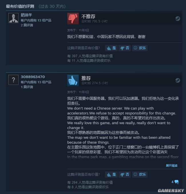 在《彩虹六号》的steam购买界面上,11月3日和11月4日监测出了大量的差评,其内容均是关于本次和谐,很多中国玩家还将自己的意见写成英文,目的就是为了让育碧看到,即便是自己去挂加速器玩外服,也不需要得到如此的“特殊对待”。