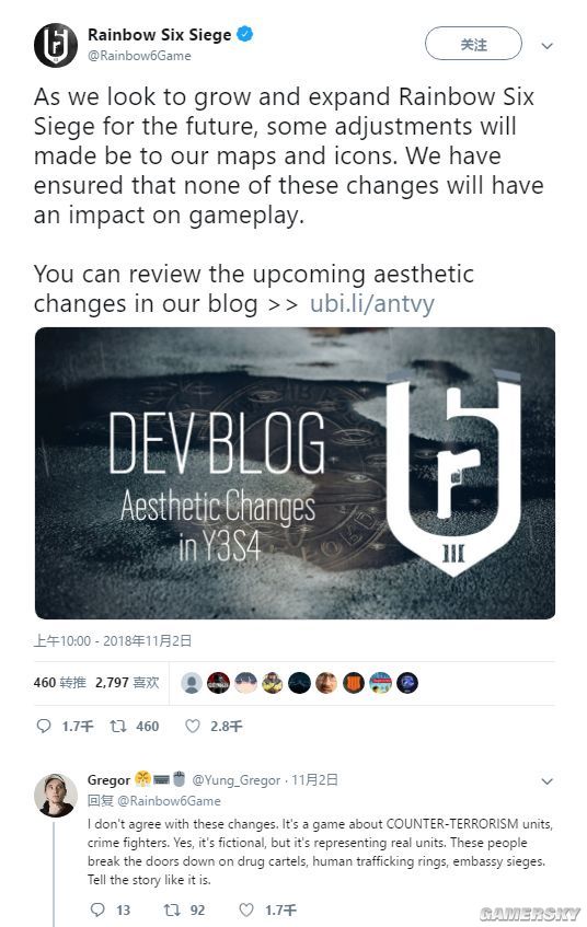 在11月3日的时候,育碧在《彩虹六号》推特上更新了一篇新闻,其内容是进入到第四季度(Y3S4),游戏中会出现相应的地图场景改变和图标更新。之所以引起讨论,完全是因为这些所谓的改动看起来更像是一种“和谐”。