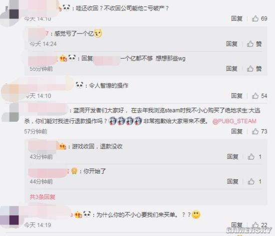 对于《绝地求生》官方这波迷之操作,玩家们在微博评论中表达了不满:“为什么官方的失误要玩家来承担后果?”,纷纷吐槽《PUBG》小家子气,令人智熄。
