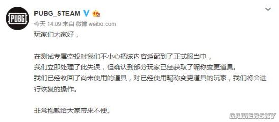 《绝地求生》官方微博今天发布公告称,在测试专属空投时不小心把该内容适配到了正式服当中。官方表示立即处理了此失误,但确认到部分玩家已经获取了昵称变更道具。于是做出了对尚未使用的道具进行回收、对已使用道具进行恢复的处理。