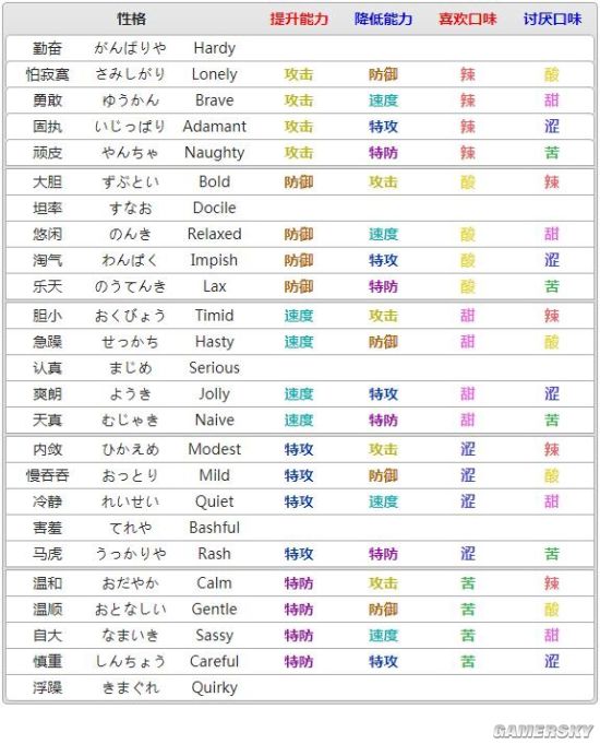 然后就是更重要的性格了。性格的具体效果如图,对于5围能力进行修正,一项能力×1.1倍,一项能力×0.9倍,加上5种不加不减,一共有35种搭配方案。
