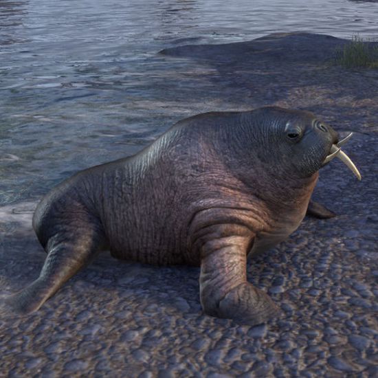 一种广泛栖息于泰姆瑞尔北部和西北部寒冷水域的半水生动物。高岩的三牙海象个头较小(和海豹差不多),天际的则远较为庞大(接近真实的海象)。虽然长有三颗牙,但大部分三牙海象并不危险,经常为其他动物捕食(和现实中的海象不大一样),它们的肉是泰姆瑞尔公认的美味佳肴,狩猎三牙海象一直是泰姆瑞尔北方沿海地区的渔民和猎人(尤其是诺德人)重要的生存方式。