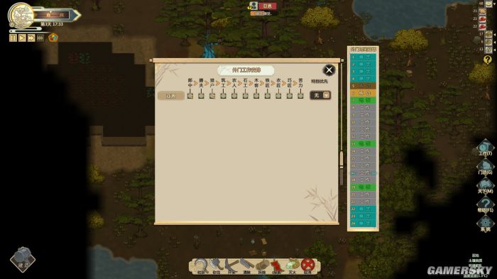 本作对于人物的操作方式有些特殊,玩家并不能控制人物自由的移动,而是需要在制定地点下达命令,使人物去自动执行。比如种地的时候,只需用鼠标框选预想农田的位置,此时角色们就会自动到达指定地点,锄地、播种、浇水均自动完成,建造建筑,拿取物品时同理。并且为了能让玩家更细致的划分每个角色的具体工作,游戏还拥有着一套非常详细的工作安排表,每个角色都有如猎户、农工、木客等数十个职位可供按情况随时调整。诚然这套工作表看似十分复杂,但一旦了解到这鞋看似复杂的选项只需按照自己安排稍作修改,便可非常高效地达到非常目的时,便会得心应手,本作中大部分系统皆是如此。