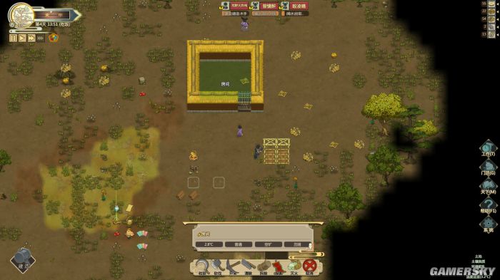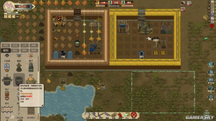 游戏初期玩家需要在身无分文的情况下,通过造房子、制造设备、种地等方式来维持生计。本作有着非常多的可建造建筑,大到房屋的墙壁屋顶,小到房间里的屏风香炉应有尽有。并且由于本作修仙的主题,建筑中还有很多诸如丹炉、炼宝台等神奇的物件儿。一方面,多种多样且每个在功能上都有着细致划分的建筑,在建造时给了我更多的可选择项;另一方面,将这些建筑按喜好一一码放在地图中,以上帝视角纵览自己“家园”的体验也令我成就感十足。