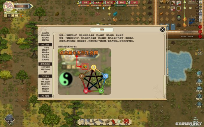 除此之外,本作在建造方面还有着一套极为考究的系统。当玩家解锁观星台后,可以查看场景中地块由金木水火土所代表的五行分布图,而根据五行相克的概念,在选择在地块上建造时玩家也需要慎重考究。比如金克木,铁矿旁边建造木桌的话桌子的风水就会受影响。甚至在房间的摆放也需要考虑风水,比如卧室要坐北朝南,房间不能有两扇门直通外界,否则会风水外泄等等。