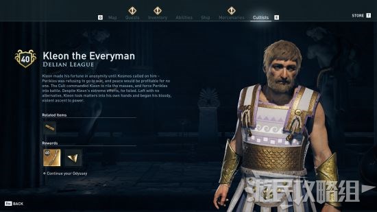 他是神教群英的贤者,同时也是全希腊佣兵排行榜上的第一名。因此,你可以在逛大地图的时候偶然遇到他,也可以通过杀死其麾下的全部神教成员来揭开他。所有的佣兵成员都在希腊旅行,位置是不固定的,遇不遇到他是你的缘分了。