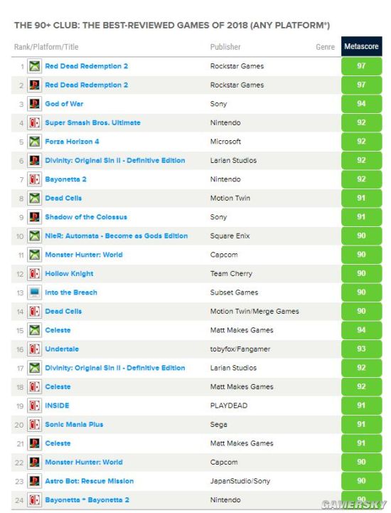 2018年评分达到90+的游戏名单: