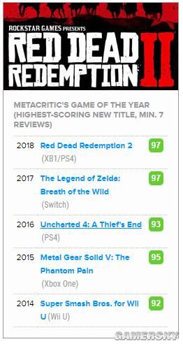 Metacritic总结了2018年里各个平台获得高分评价的优秀游戏作品。最终《荒野大镖客:救赎2》以97分全场领跑。