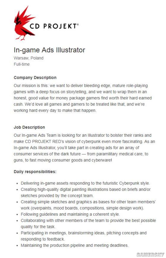 近日,CD Project Red在官网上公布了一则招募信息,要求招聘一名经验丰富且热爱流行文化的设计师来为他们的新作《赛博朋克2077》制作广告,只不过这些广告将用来“宣传”游戏内的那些恶名昭著的超级公司。