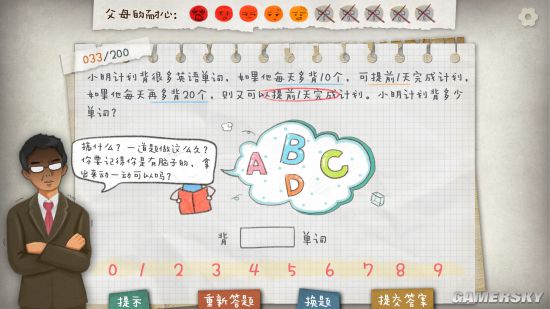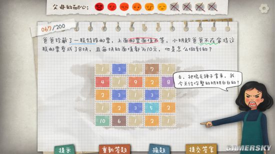 玩家在游戏中需要解开总数200道以上数学谜题来体验小学生做作业,游戏中没有时间限制,但拖延时间过久会触发父母各种嘲讽和打击