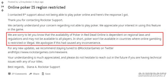 Reddit网友Insydedan贴出了收到的R星客服的回复:“我们很抱歉地告诉您,《荒野大镖客OL》中德州扑克的可玩性取决于当地法律和章程,也许不是所有玩家都可用。简而言之,在网络赌博非法和受到限制的国家,玩家无法玩德州扑克,如果给您带来不便,我们深表歉意。”