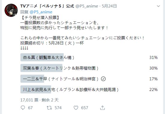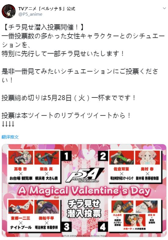 《女神异闻录5》动画官方推特前日推出了一项投票活动,将小姐姐们分成了四组,粉丝们可以依照自己的意愿进行投票,官方将为得票数最高的组合放出一些先行预览。