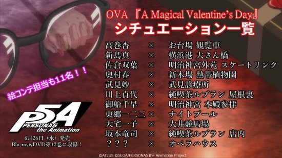 《女神异闻录5》动画BD&DVD第十二卷将在6月26日发售,届时还将收录情人节OVA动画“A Magical Valentine’s Day”。在OVA当中,“九艘跳”的Joker将和女主角们一起在东京度过美好时光。官方近日公布了一组OVA艺术图,一起来欣赏一下。