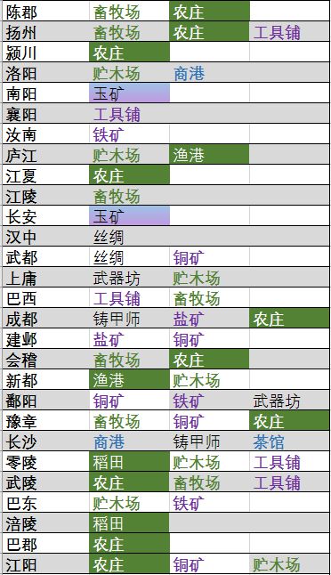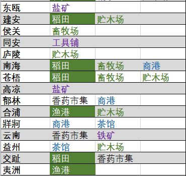 从资源点来看,任何郡,最多只有一个生产粮食的资源点,绝对没有大于1个的。比较好的就是稻田+贮木场这种除了加粮食还能加农业产值的(苍梧最好,建安也不错,都在南部沿海)。(稻田>农庄>渔港,贮木场>畜牧场)