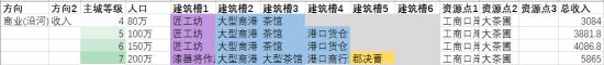 第二个是城市以外的资源点。资源点的加成也算在整个郡县的加成中,和城市的建筑加成合并计算。因此如果资源点给力的话,加成会非常高。例如长沙和牂牁(zang ke),都是一个商港加一个茶馆,各自提供了大量的基础商业产值。加上资源点后的河边城市收入如下(与上图的河边城市对比):