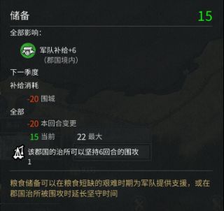 粮食储备是单个郡国治所的属性。储备越高,能够坚持的围城数越高。此外储备还会影响部队补给(进而影响补员)。储备为负,会降低公共秩序。粮食储备和粮食(郡)是不同的资源。粮食是派系资源,粮食储备是郡城的属性。