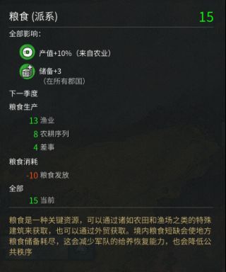 粮食丰富,影响全局储备的增加情况,还影响全局性农业产值(不多)。粮食为正时,会增加各个郡的粮食储备。