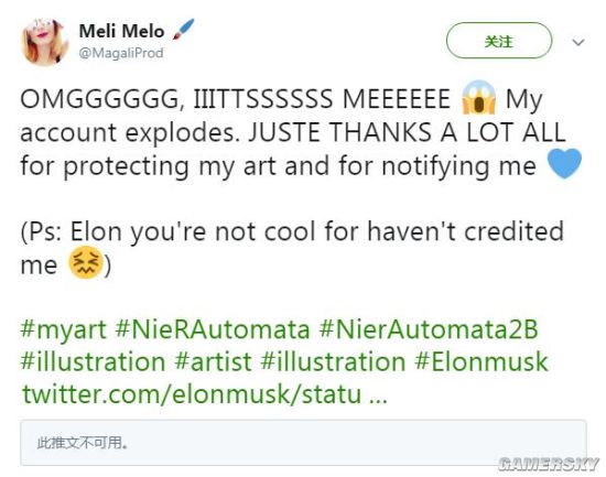另外,这张2B同人图的原作者Meli Melo也在推特上对此事进行了回复,她向那些保护她的作品并通知她此事的人致谢,同时表示埃隆·马斯克不给自己作品署名的行为真的一点都不酷。