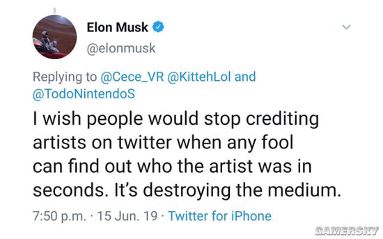 特斯拉的CEO埃隆·马斯克昨天在推特上分享了一张《尼尔:机械纪元》中人气角色2B的同人图,不过并没有标注作者,不少网友在评论中提醒他记得给原作者署名,没想到这位“放荡不羁”的企业家竟然直接回复了“不”,着实让人感到困惑。