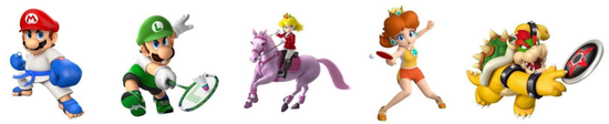马力欧、路易吉、桃花公主、菊花公主、酷霸王、瓦力欧、瓦路易吉、耀西、森喜刚、酷霸王Jr.