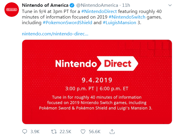 任天堂宣布将在北京时间9月5日早上6点举办长达40分钟的直面会,介绍2019年发售的NS游戏,包括《宝可梦:剑/盾》与《路易基鬼屋3》。