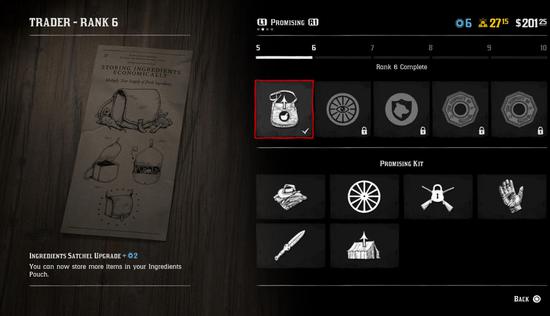 例如,商贩的新手工具可让玩家获得七件商贩职业物品,包括独特的马鞍、枪腰带和一个炖锅,好为玩家的营地提供新鲜的食物来补充玩家的核心值和玩家团队成员的核心值(还有能达到黄金核心状态的特殊炖汤配方),赏金猎人的资深工具则能让玩家获得七件赏金猎人职业物品,包括一辆可容纳多个悬赏目标的赏金猎人马车,用来缠绕通缉犯腿脚的投掷武器困兽索,一套新的装束级更多内容。