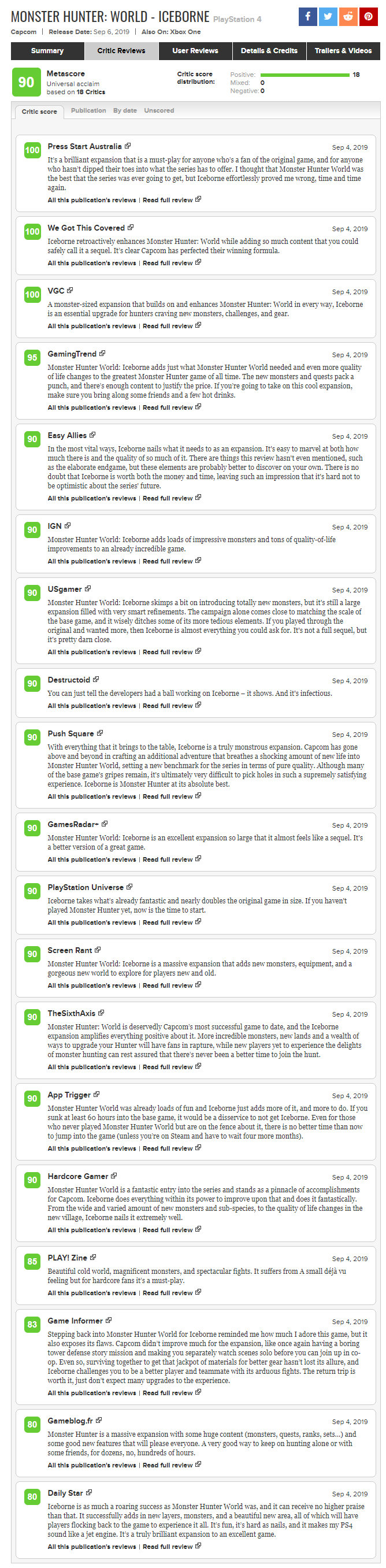 《怪物猎人:世界》冰原DLC的媒体评分正式解禁,截至发稿前这款扩展资料片在metacritic上的媒体均分达到90,收录的18家媒体都打出了好评。