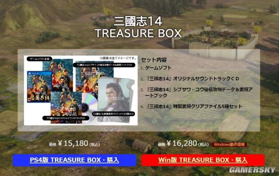 宝箱版:游戏本体、《三国志14》原声CD、《三国志14》秘密攻略&武将画册、《三国志14》5组特制武将档案。