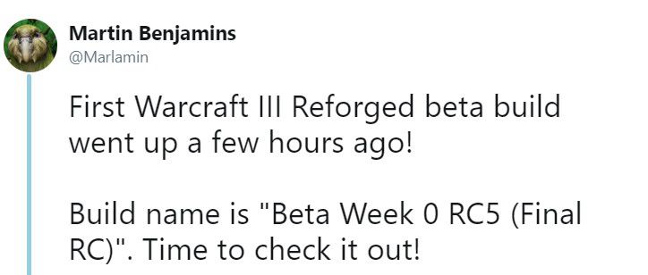 Martin Benjamins在推特中写道:《魔兽争霸3:重制版》首次B测已于几小时前开启,B测版本名称为:“Beta week 0 RC5(Final RC)”,快一起去看看吧!