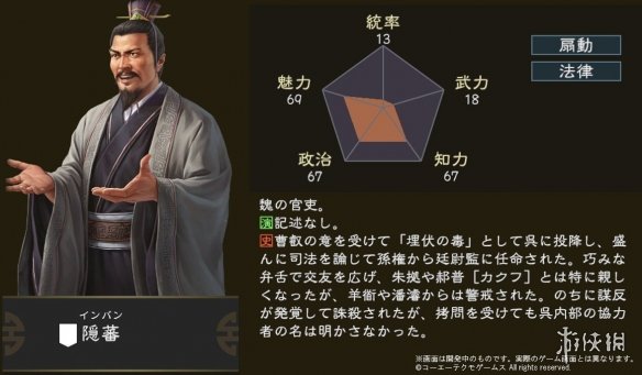 从官方公布的图片中我们可以看到隐蕃在本作中的形象以及其对应的五维数据。隐蕃的五维中魅力最高,统率最低,另外在他的五维图旁边标有“扇动”、“法律”的标签,玩家可以根据官方提供的相关数值和标签来配置隐蕃。