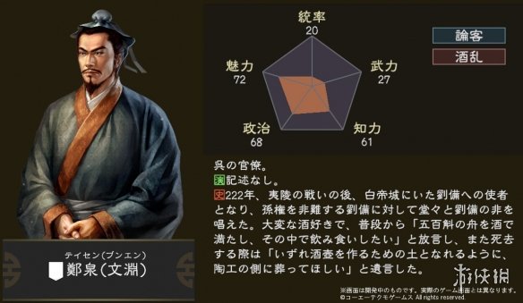 从官方公布的图片中我们可以看到郑泉在本作中的形象以及其对应的五维数据。郑泉的五维中魅力最高,统率最低,另外在他的五维图旁边标有“论客”、“酒乱”的标签,玩家可以根据官方提供的相关数值和标签来配置郑泉。