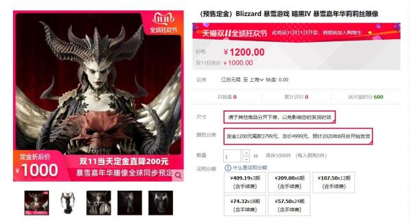 这款《暗黑破坏神4》莉莉丝手办在暴雪旗舰店同样开启了预售,目前需要付定金1200元,双11期间需付定金1000元,然后再付尾款3799元,总金额4999元。