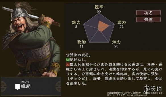从官方公布的图片中我们可以看到韩起在本作中的形象以及其对应的五维数据。韩起的五维中武力最高,魅力最低,另外在他的五维图旁边标有“功名”、“强欲”的标签,玩家可以根据官方提供的相关数值和标签来配置韩起。