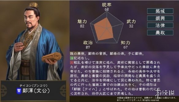 从官方公布的图片中我们可以看到郑浑在本作中的形象以及其对应的五维数据。郑浑的五维中政治最高,武力最低,另外在他的五维图旁边标有“筑城”、“振兴”、“法律”和“农政”的标签,玩家可以根据官方提供的相关数值和标签来配置郑浑。