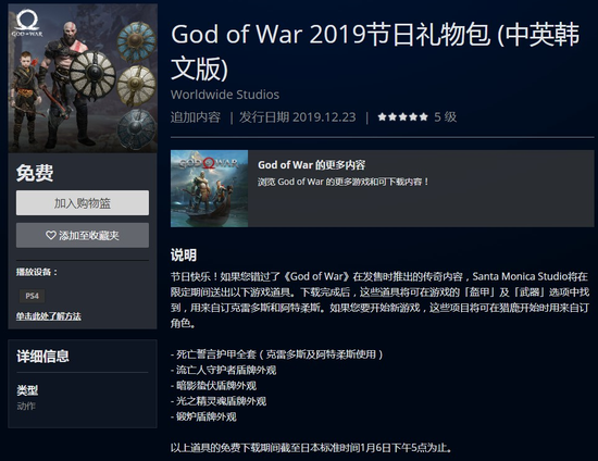 今日,PS商城上架了一款《战神》2019节日礼物包,其中包含奎爷和阿特柔斯的装备、外观道具,所有已经购买过游戏的玩家均可使用该追加礼物包,领取日期截止至1月6日下午5点。