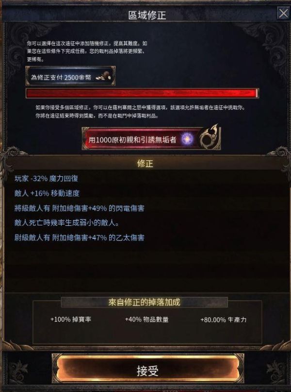 开启远征地图后会进入这画面,刚开始只能选择专家,打完专家三层后可开启老手模式,花2500金币可在三个选项中给地图一条词坠,每条词可以提升掉保率、物品数量、生产力(风暴港相关),最多可拥有5条