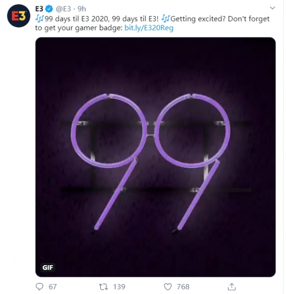 每一年的E3大展的举办方“美国娱乐软件协会(ESA)”近日确认将会有序的全速推进E3 2020大展的规划工作,一切照旧正在按计划进行,并且发布了距离开幕还有99天的倒计时图片。