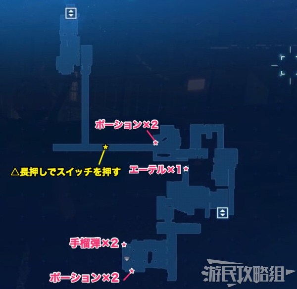 【手榴弹】所在的宝箱附近有障碍物阻挡,比较容易忽略,对障碍物使用普通攻击(□键)即可清除。