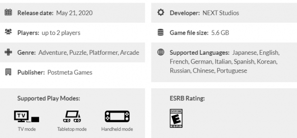 据eShop信息显示,本作数字版容量接近6GB,支持TV、掌机以及分离全三种模式游玩。这是一款具有物理特性的合作冒险游戏。 游戏中,玩家和伙伴将扮演“阿古”和“茜拉”,两个双足外星机器人,并在地球上展开有趣又燃情的大冒险。你们将前往一个个景色迥异的秘境,相互配合相互帮助,解开谜题克服挑战!